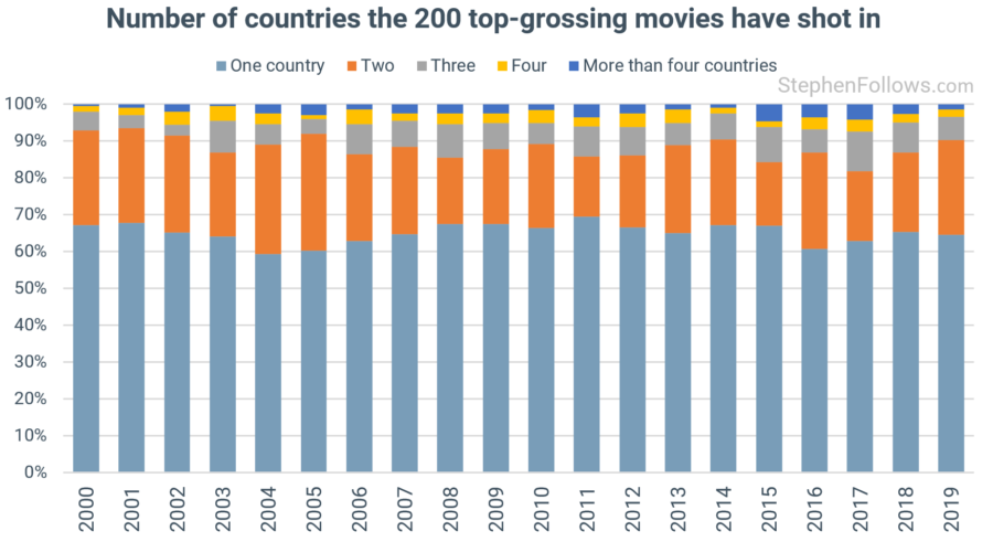 Just under two-thirds of films only shoot in one country, 23% shoot in two and the remaining 12% shoot in three or more countries.