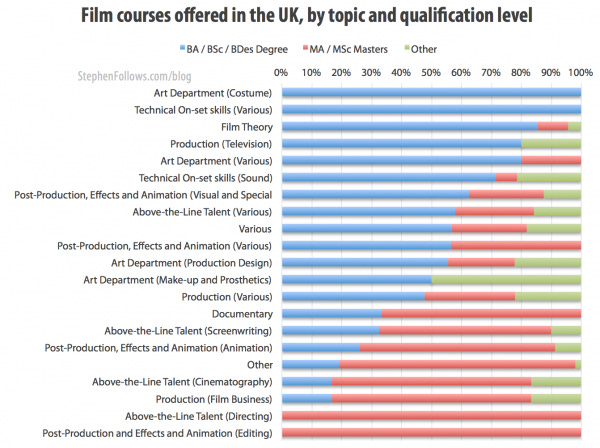 The majority of specialised MAs however are in Screenwriting (this is perhaps a result of the limited costs associated with offering such courses) and Visual Effects or Post-production Courses (this is more likely to be a product of demand).