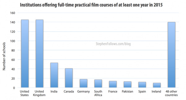 I found a total of 608 schools actively offering a full-time film-related course, with at least some practical filmmaking elements, lasting at least a year and starting in 2015. These schools are across 59 countries in the world, although nearly half are based in the United Kingdom or the United States.