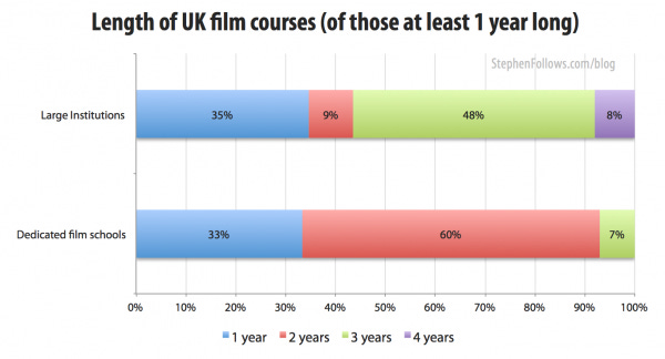 Almost all film courses associated with a larger intuition (such as a university) are taught over three years, compared with just 7% of courses at dedicated film schools.