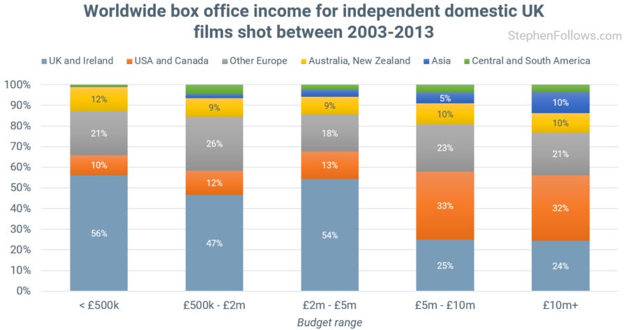 Below is the chart which raised the question. It's a BFI analysis of ComScore data which shows where UK domestic independent films earn their box office income around the world. The majority of films budgeted under £5 million earned over half of their global box office income from the UK.