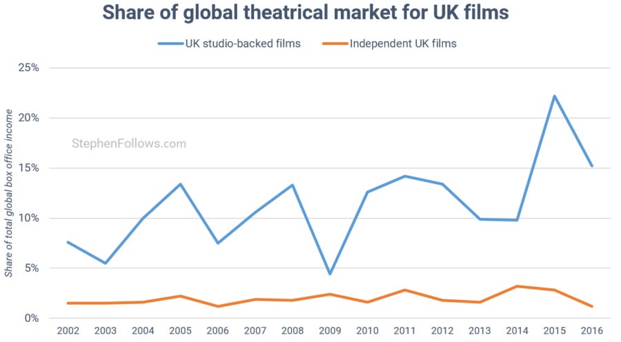 So far we have been focusing on independent UK films (i.e. those without the backing of a US studio). In 2016, these films collected just 1.2% of the global cinema box office (down from a high of 3.2% in 2014).