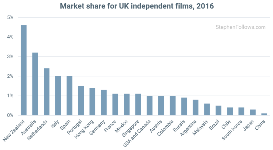 UK independent films are very popular in New Zealand, capturing almost 5% of the country's box office income in 2016. On the flip side, British indie films perform badly in many Asian countries, including China, Japan and South Korea.