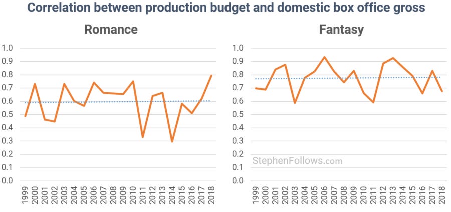 The trends for Romance and Fantasy movies are static (although within a fairly volatile year-on-year picture).