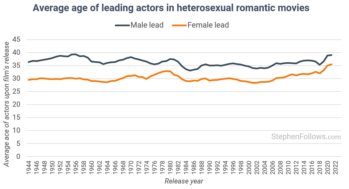 This steady discrepancy creates a predictable gap between the ages of heterosexual romantic leads. Since the 1940s, men have almost always been older than their love interests.