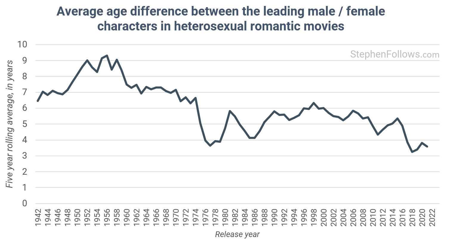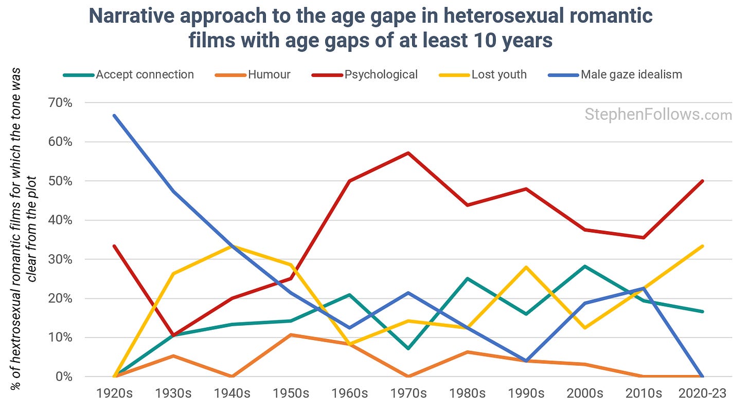 For those films I could tell the approach from the plot, I looked at how the culture around romantic age gaps has shifted over time.