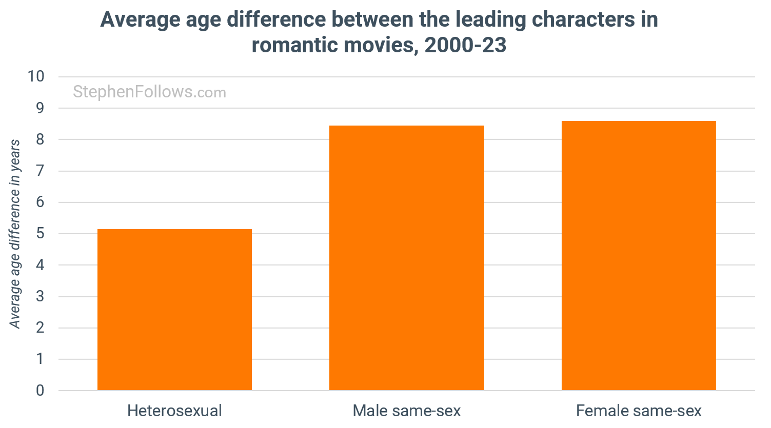 Although the sample size was much smaller, I did analyse a subset of films featuring same-sex romantic relationships. Interestingly, when gay male or female pairings do appear on screen, the leads tend to be older on average than their heterosexual counterparts.