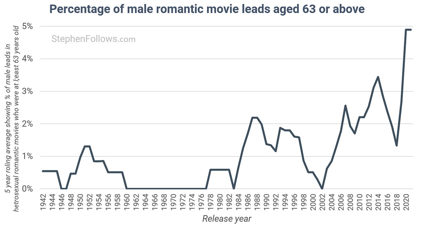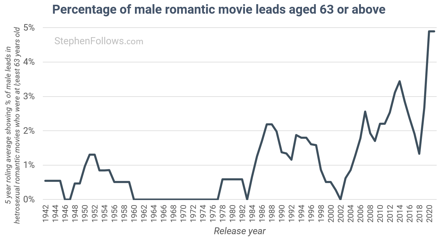 Across the 1950s and early 60s, fewer than 1% of male romantic leads were over 63. The figure flatlined for most of the 1970s. It rose slightly in the 1980s with a few notable appearances by Sean Connery and Burt Lancaster, then climbed again in the early 2010s. But even at its highest point in the last few years, only 4.9% of romantic male leads were in Clooney’s age bracket.