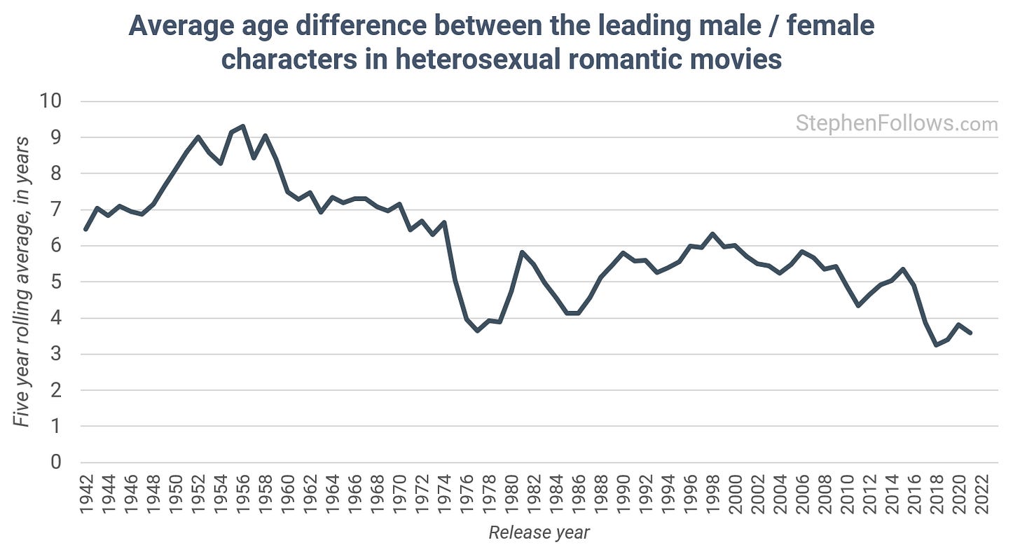 The data reveals that while the age gap has persisted, the way filmmakers have dealt with it has moved around quite a bit.