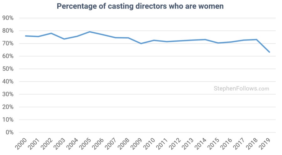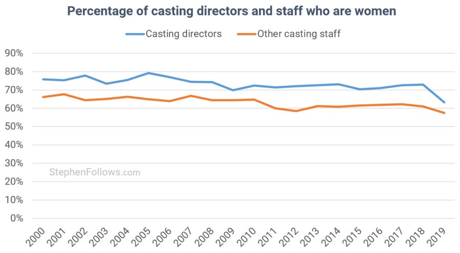 In fact, most jobs in the casting departments are taken by women, albeit not quite to the same extent as with the top job of casting director. In the chart below, "Other casting staff" include assistants, associates, interns, co-ordinators and other such roles.