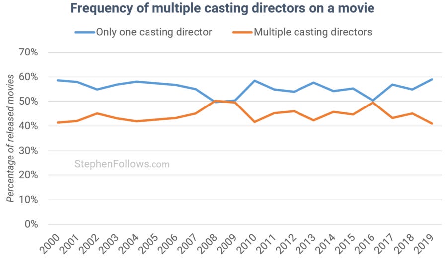 Before we finish, I wanted to share a few other things I found in the course of today's research. Across all the movies I studied, 55% had just one casting director, 32% had two, 9% had three and 4% had more than three.