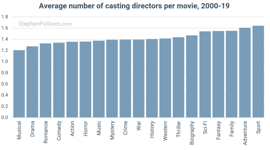 Finally, the genre of the movie appears to only have a very mild effect on the number of credited casting directors. Musical had the fewest (an average of 1.2 per movie) and sports movies having the most (1.6 per movie).