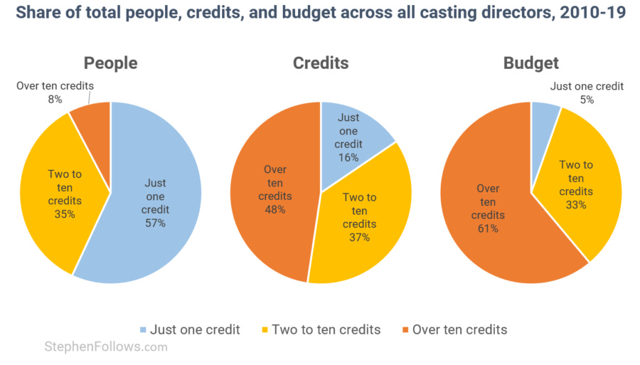 The first, (labelled as "People"), focuses on the number of individuals involved, revealing that 57% of people who receive any casting director credit do not go on to gain a second. The second chart ("Credits") shows that 48% of casting director credits go to people who earned more than ten such credits. The final chart ("Budget") shows the share of the combined production budgets, revealing that 61% of the money is spent on projects cast by people with more than ten credits.