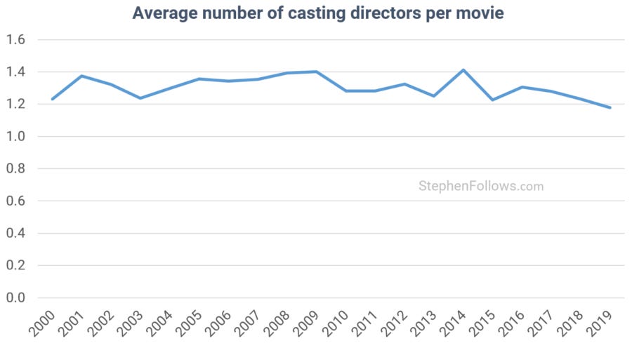 We saw previously that the gender split among casting directors had remained pretty static over the past two decades. The same is true for the average number of casting directors on a movie, averaging at 1.3 across all titles. Given the huge changes we seen in other roles over this period, it is noteworthy that the casting world seems to have held firm over such a long period of time.