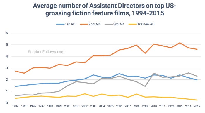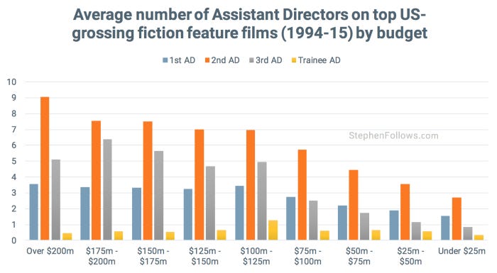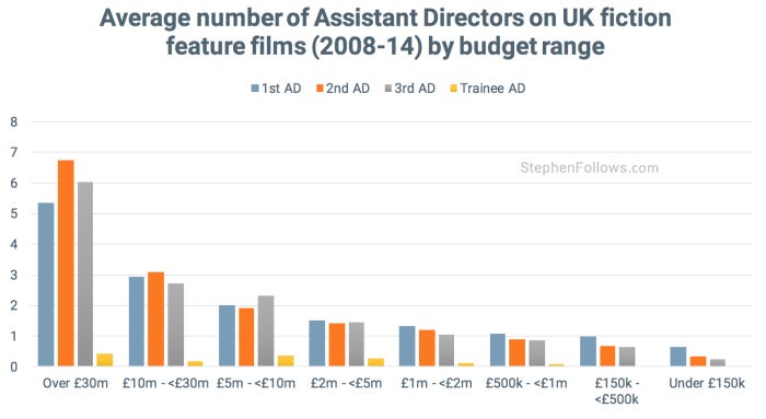 A couple of years ago I looked at the number of Assistant Directors on Hollywood films. I want to return to the topic as I now have more data, I can add the UK figures into the mix and because I have conducted interviews with over 30 working 1st ADs in the UK and US to get the human perspective. Today, I'll be looking at the data and next week I'll share the views and opinions of 1st ADs.