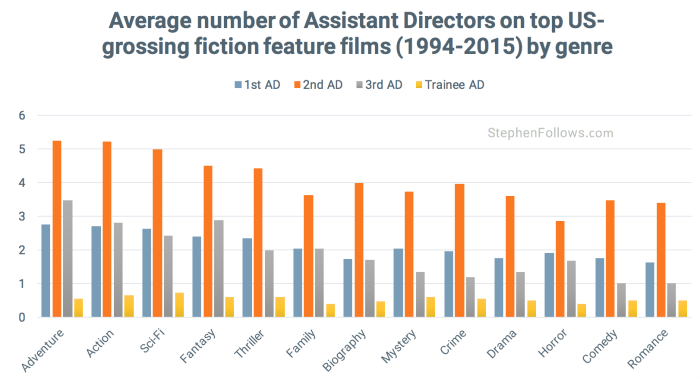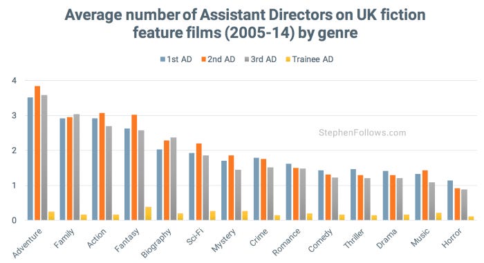 Turning to genre, we can see that films with high levels of adventure, action and fantasy require the largest number of ADs. The genres with the smallest AD departments include horror, drama and thriller.