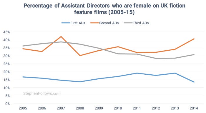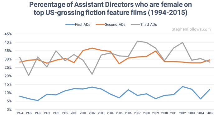 We can't tell too much about the ADs from the outside (such as age, race, experience levels, etc) but we are able to ascertain their gender. Like most crew members in the film industry, there is a heavy male skew and as we move up in seniority, we see an even greater number of roles going to men.