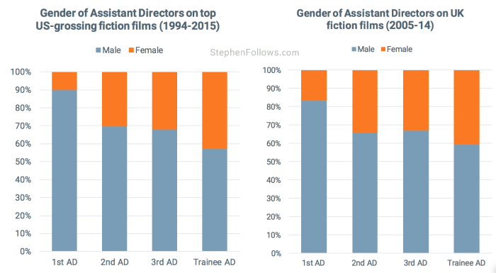 90% of 1st ADs on top US-grossing films are men, as are 83% of 1st ADs on UK films. Trainees are much closer to gender equality, with men making up 57% of trainees in the US and 59% in the UK.