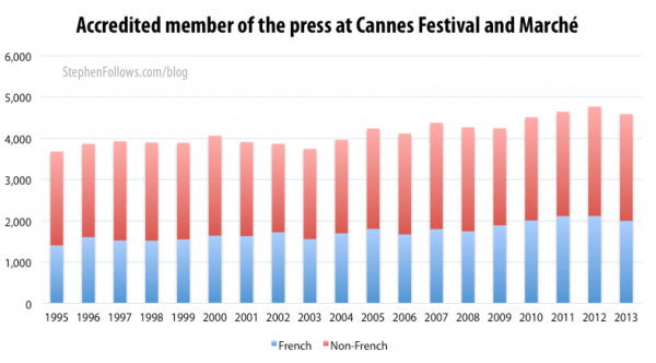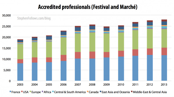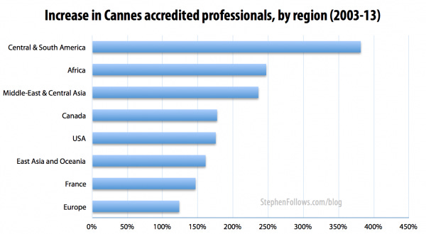 Accreditation has increased to 157% compared to a decade ago. Two thirds of all people who attend the Cannes film festival are from Europe, although in recent years the biggest increases have been from South America and Africa.