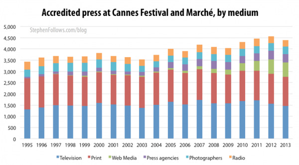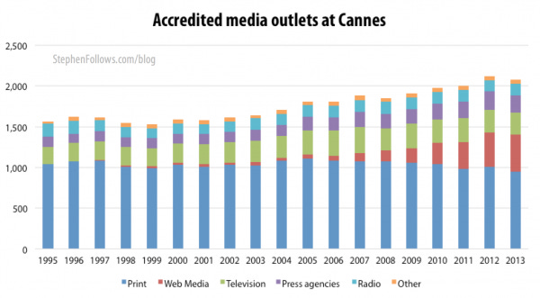 The chart above shows that the Cannes officials hugely favour French journalists and the same can be said for print publications. The first web publication to be accredited was in 1995 but it wasn't until 2007 that the number of web journalists crossed 100.