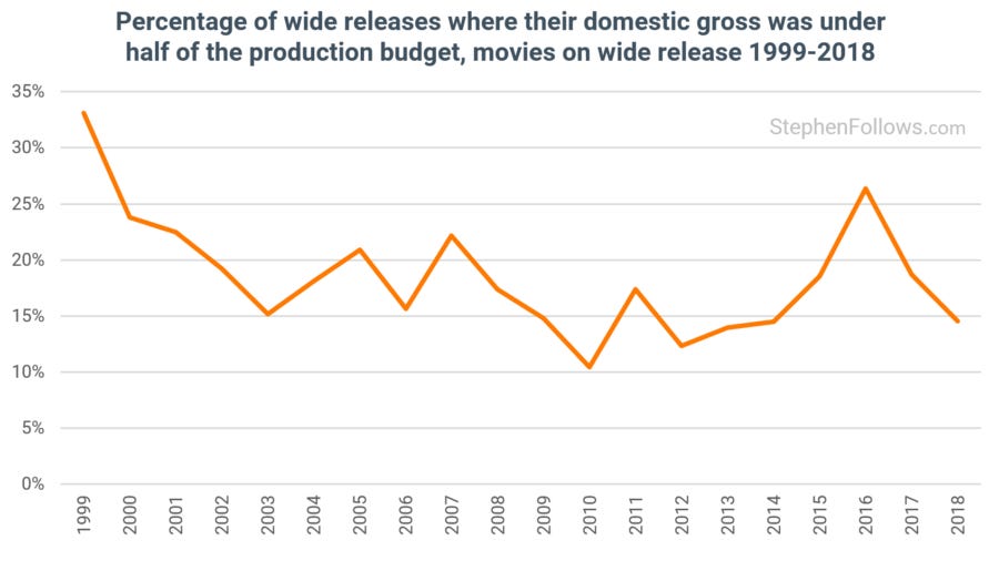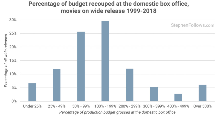 In the film industry, "domestically" means in America and Canada and a "wide" release is where the film was available in at least 600 cinemas in a single week. So a film which cost $50 million to make but which grossed under $25 million in American and Canadian cinemas could qualify. Later, we'll add in the worldwide gross and see how that changes things.