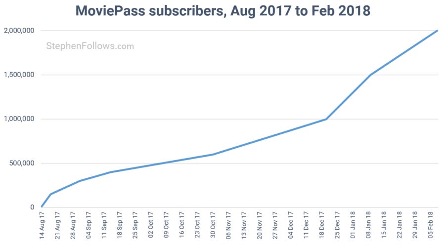 MoviePass' success has been rapid. Data is hard to come by as they're a private company, but based on the numbers they have published, the chart below shows their recent subscriber growth.
