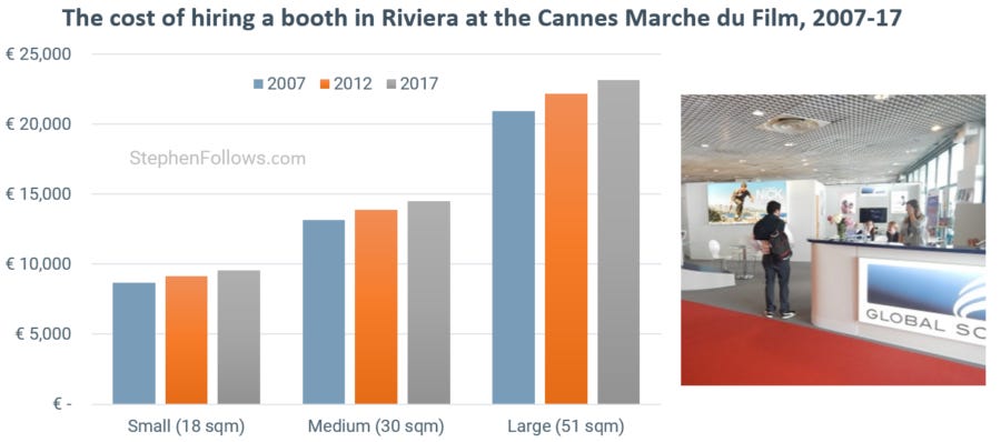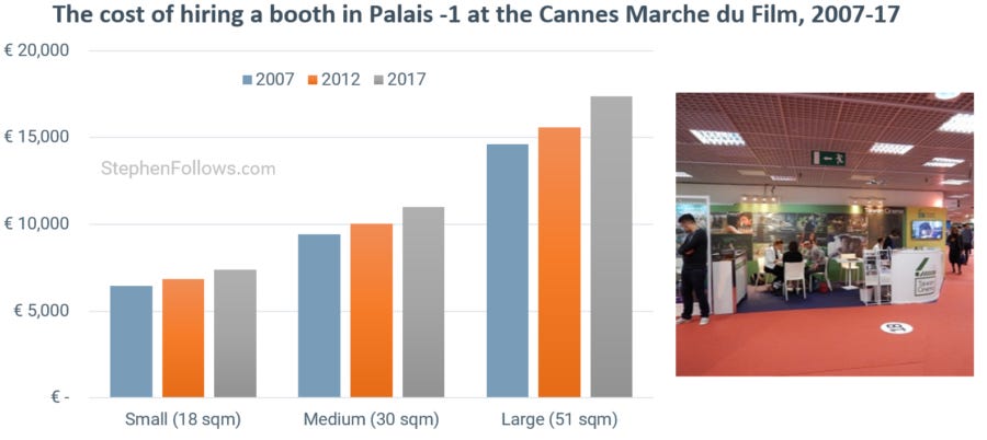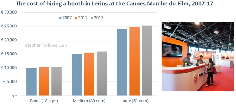 And finally, the Lerins level costs €6,425 for the basic booth and €449 per additional square metre. That's 15% more than Riviera and 45% more the Palais -1. Lerins booths have risen by the smallest margin over the past ten years, growing by just 4.4% in ticket price (which is actually 7.3% less than ten years ago, when accounting for inflation).