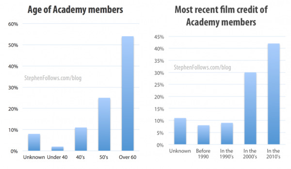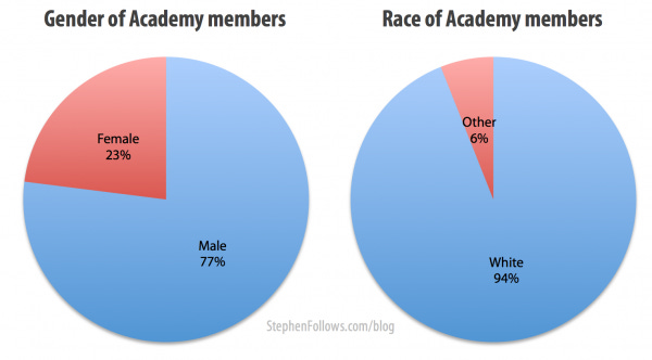 Oscar voters are 94% white, 77% male and have a median age of 62.