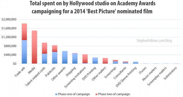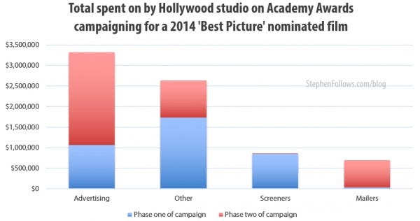 Across these four films, 53% went on advertising, 12% on screeners and 35% on other costs. Obviously, we can’t know how representative these films are of all Hollywood campaigns but the evidence I have suggest that they are a good guide.