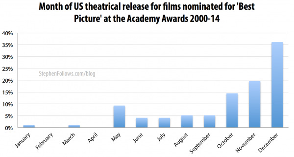 It turns out that 56% of films nominated for 'Best Picture' at the Academy Awards between 2000 and 2014 were first released in the US in either November or December.