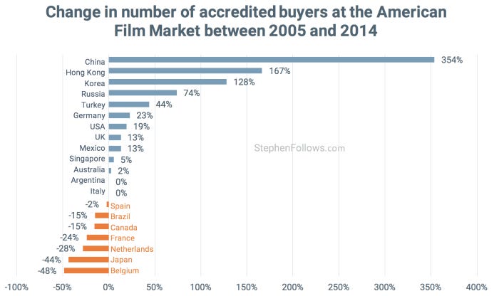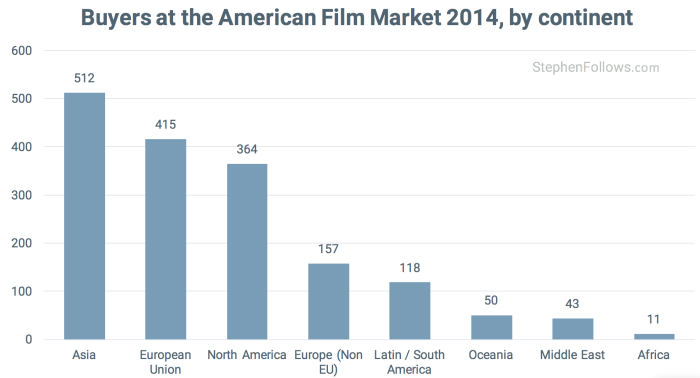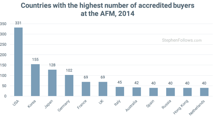Over the past decade, the AFM has had accredited buyers from 80 different countries in total. Unsurprisingly, the country sending the largest number of buyers to attend the American Film Market is America, with 331 accredited buyers attending in 2014 (20% of all buyers).