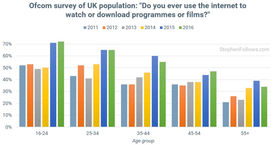 In 2011 the answer was 36% but by 2016 it has grown to 53%. Depending on your age, this may seem like a lot or very few. That's because your propensity to watch online content is heavily connected to age. Last year, 72% of 16 to 24-year-olds said that they had watched online content, whereas just 34% of those over 55 years old had.