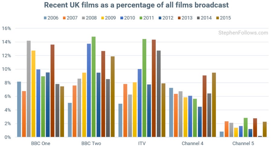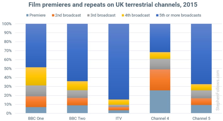 Not only that, but on most channels the vast majority of film screenings are repeats. In 2015, only 7% of films screened on BBC One were premieres, only 9% on BBC Two, 9% on Channel 5 and a dismal 4% on ITV. By contrast, Channel 4 appears much more committed to new movies, with new movies representing 26% of their film output.