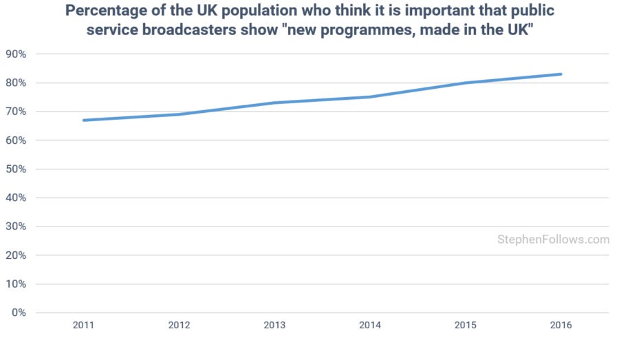 83% of the UK population believe it's important that public service broadcasters show UK-made programmes, up from just 67% six years ago.