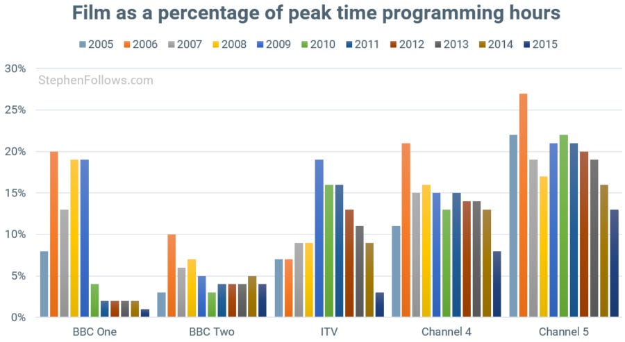 Films have had an increasingly hard time on UK terrestrial channels over the past decade. In 2006, 17% of peak-time hours were devoted to movies, whereas by 2016 that had dropped to just 6%.