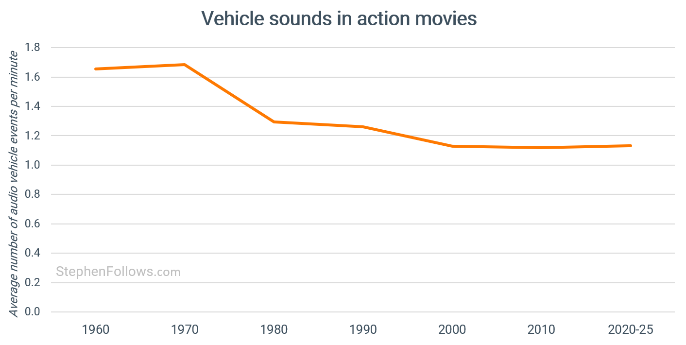 Here’s one I didn’t expect. Vehicle sounds in action films have declined by 16% since 2000. This neatly tracks with my past research showing that the fastest declining cliché in movies is “Follow that [vehicle]”.