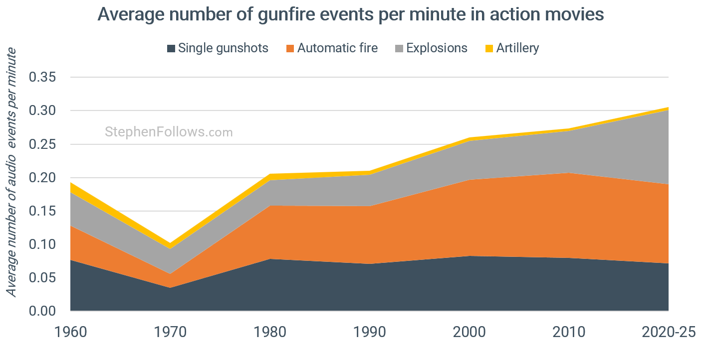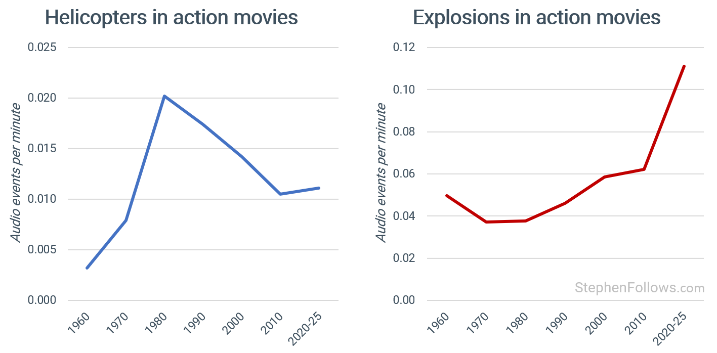 I analysed the audio from nearly 2,000 action films across 75 years to track how their sound has changed. We're seeing shifts in gunfights, explosions, vehicles, music and more.