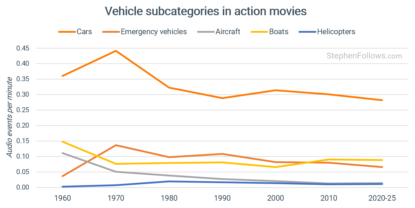 Helicopters peaked in the 1980s at 0.02 EPM and have been declining since. This is almost certainly the Cold War and Vietnam War’s influence on 1980s cinema, with Apocalypse Now, Blue Thunder, Rambo, and their imitators filling the soundscape with rotors. Modern action has replaced the helicopter with drones (which are sonically quiet) and CGI spacecraft.