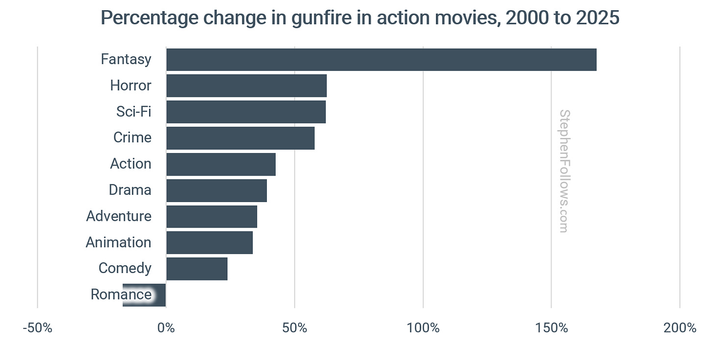 The rise in gunfire is also seen in other genres. Fantasy films have seen a marked increase this century, as the genre shifts from Middle-earth to the Marvel Cinematic Universe.