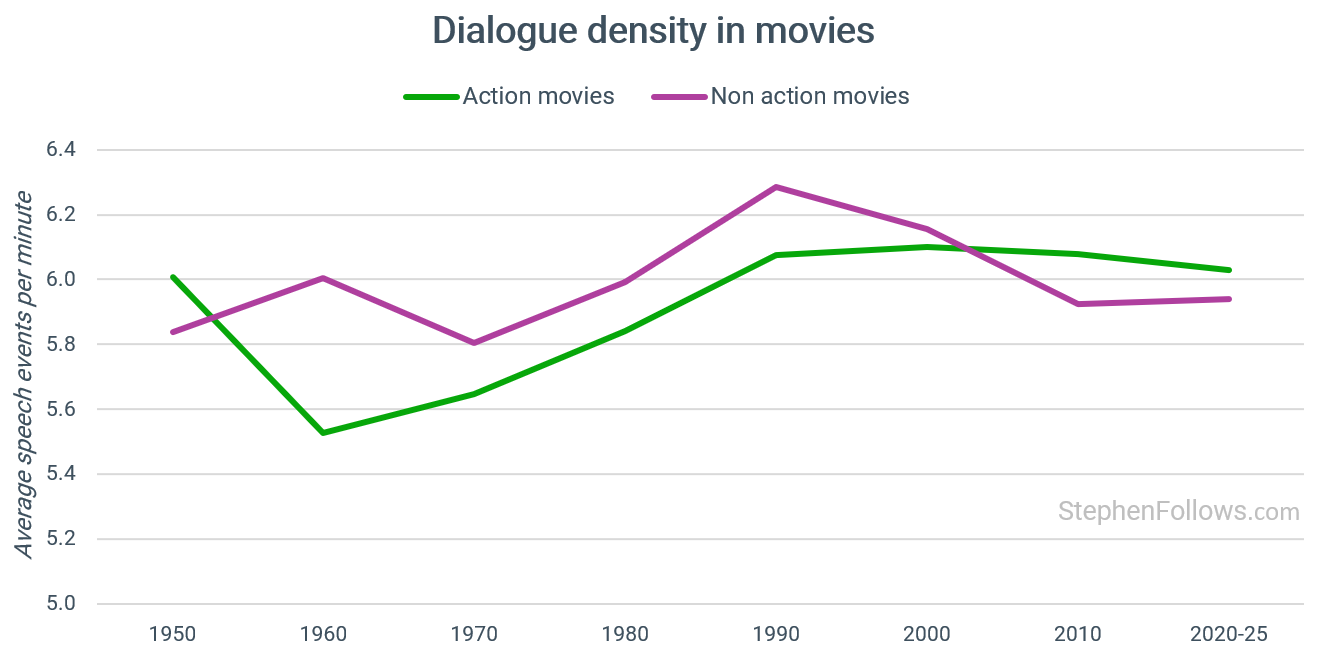Speech is remarkably stable. Action heroes talk about as much now as they did in the 1970s, roughly 6.0 speech events per minute. Despite the increase in gunfire and explosions, dialogue density hasn’t been squeezed out. Modern action heroes simply talk between the explosions rather than instead of them.