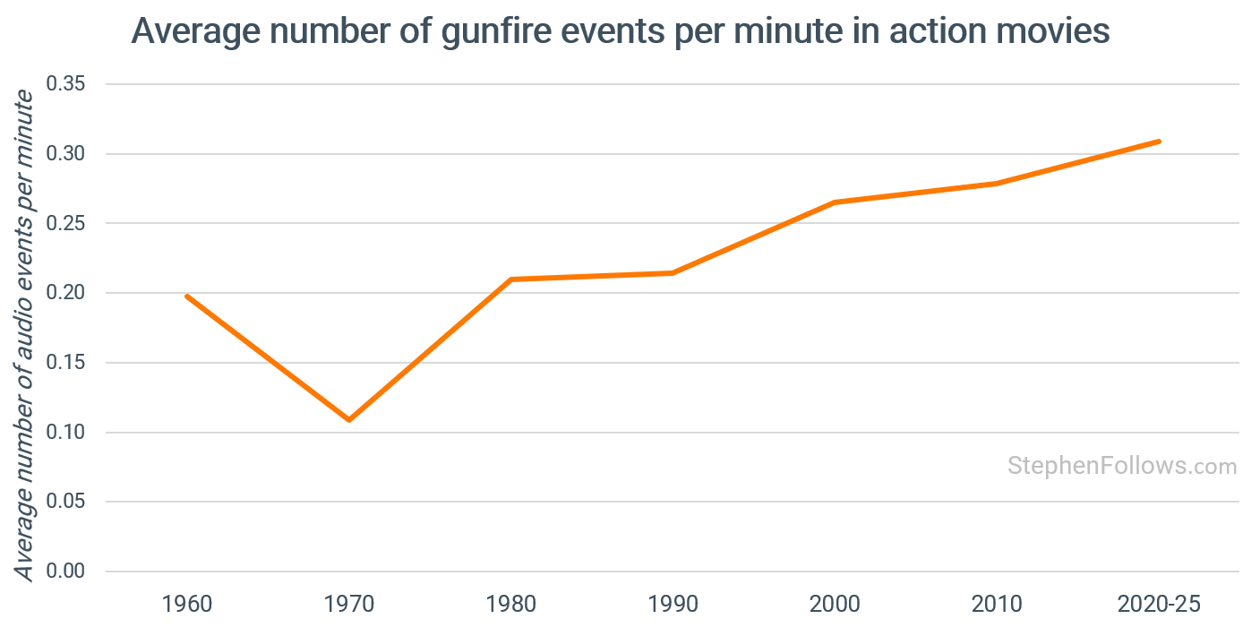A major finding is that gunfire events in action films have increased by 43% since 2000. Pre-2000, a typical action film averaged 0.196 gunfire events per minute. Post-2000, it’s 0.280.