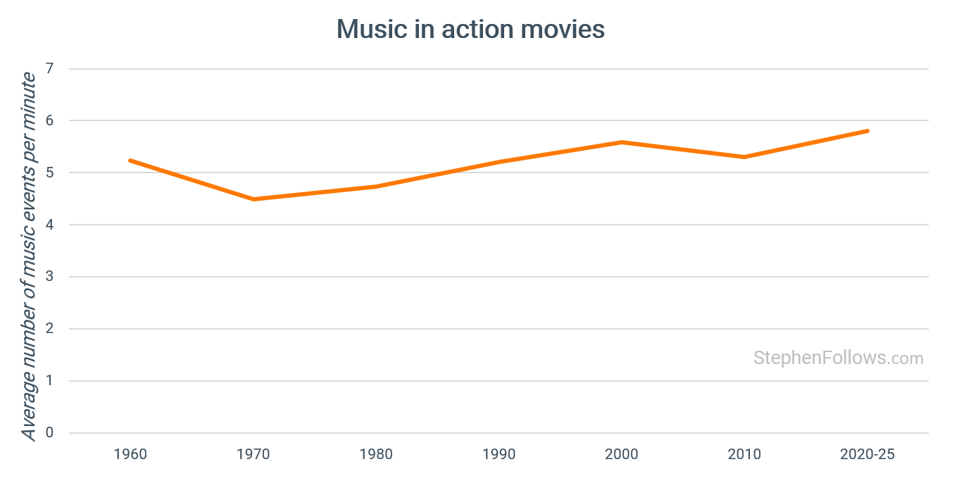 Music scoring in action films has risen by 9% since 2000, from 5.04 to 5.48 events per minute. That’s the largest absolute change of any sound category (+0.44 EPM).