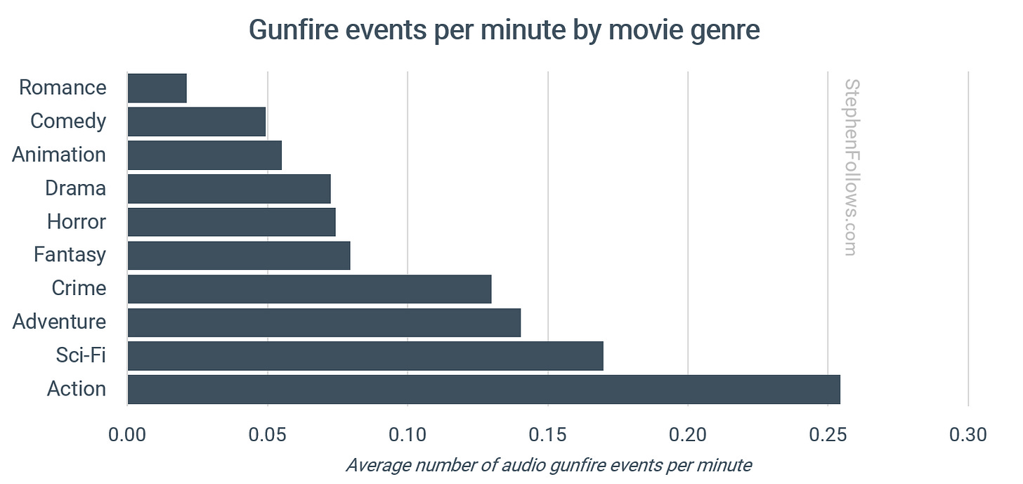 Despite the rise in fantasy and horror gunfire, action still tops the list of gun-heavy genres.