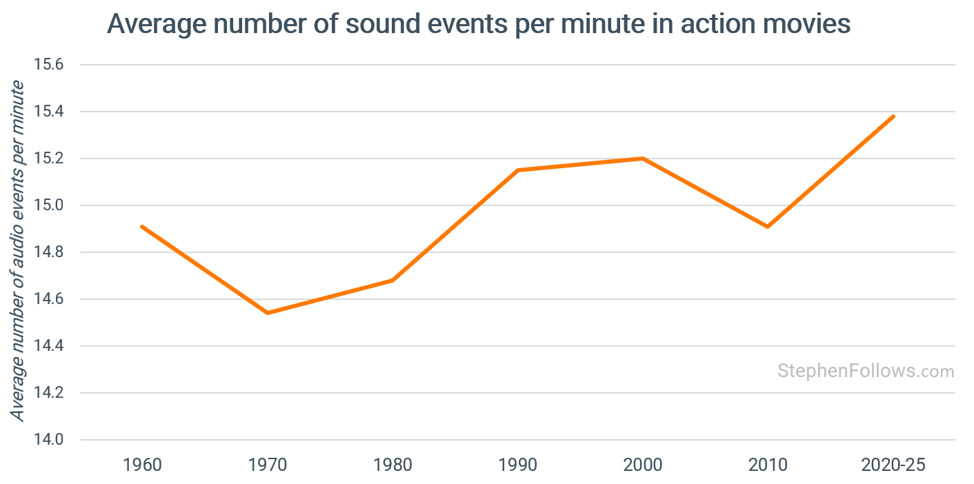 A modern action film packs in roughly 15 distinct sound events per minute. In the 1970s, it was closer to 13. That might not sound like a dramatic shift, but it adds up. Over a two-hour film, that’s about 240 extra sound events competing for your attention.