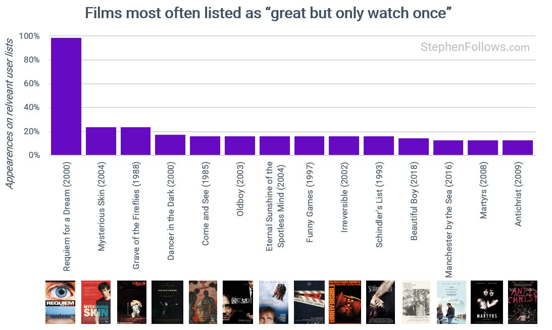 Looking at the data behind which films appear on user-generated lists of 'Movies which are awesome, but I don't ever want to watch again' reveals what feeling audiences never want to return to.