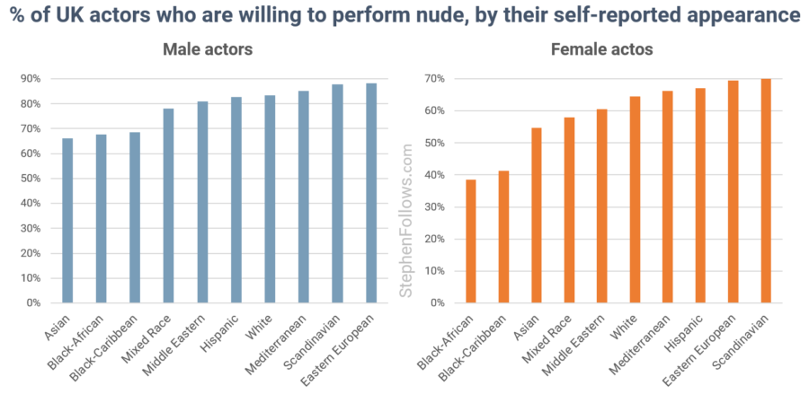 Those who describe themselves as "Scandinavian" or "Eastern European" are the most open to professional nudity, with those referring to themselves as "Black-African", "Black-Caribbean" or "Asian" the least. This holds true for both male and female actors.