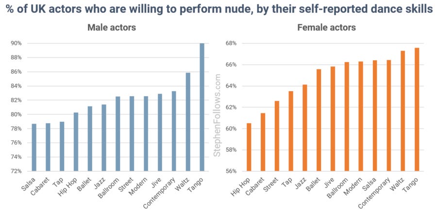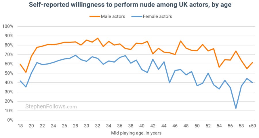 We cannot get inside the head of every actor facing this choice, but we are able to measure what actors mark on their professional profile in relation to their willingness to perform nude. The data for today's piece comes from my database of every working actor in the UK who has a public profile (see the notes section at the end of the article for my sources and methodology). This includes 66,011 actors, ranging from A-list names through to new and emerging talent.