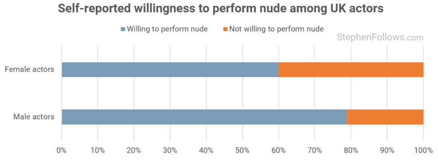Across all UK performers, 60% of female actors say they are willing to perform nude, and 79% of male actors.
