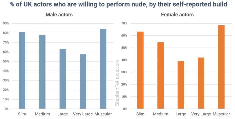 Finally, the connection between body shape and attitude to nudity is that as performers get larger, they are less keen to bare all. 81% of 'slim' male actors are willing, compared to 56% of 'very large' male actors. The same is true for female actors, with 63% for 'slim' and 42% for 'very large'.