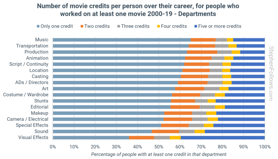 Let's widen out to the whole crew, looking at the different departments. In line with what we saw above, people working in the music department are the least likely to work in film again, with 65% only receiving one credit. At the other end of the spectrum is the visual effects department, where just under two thirds of people receive two or more credits.